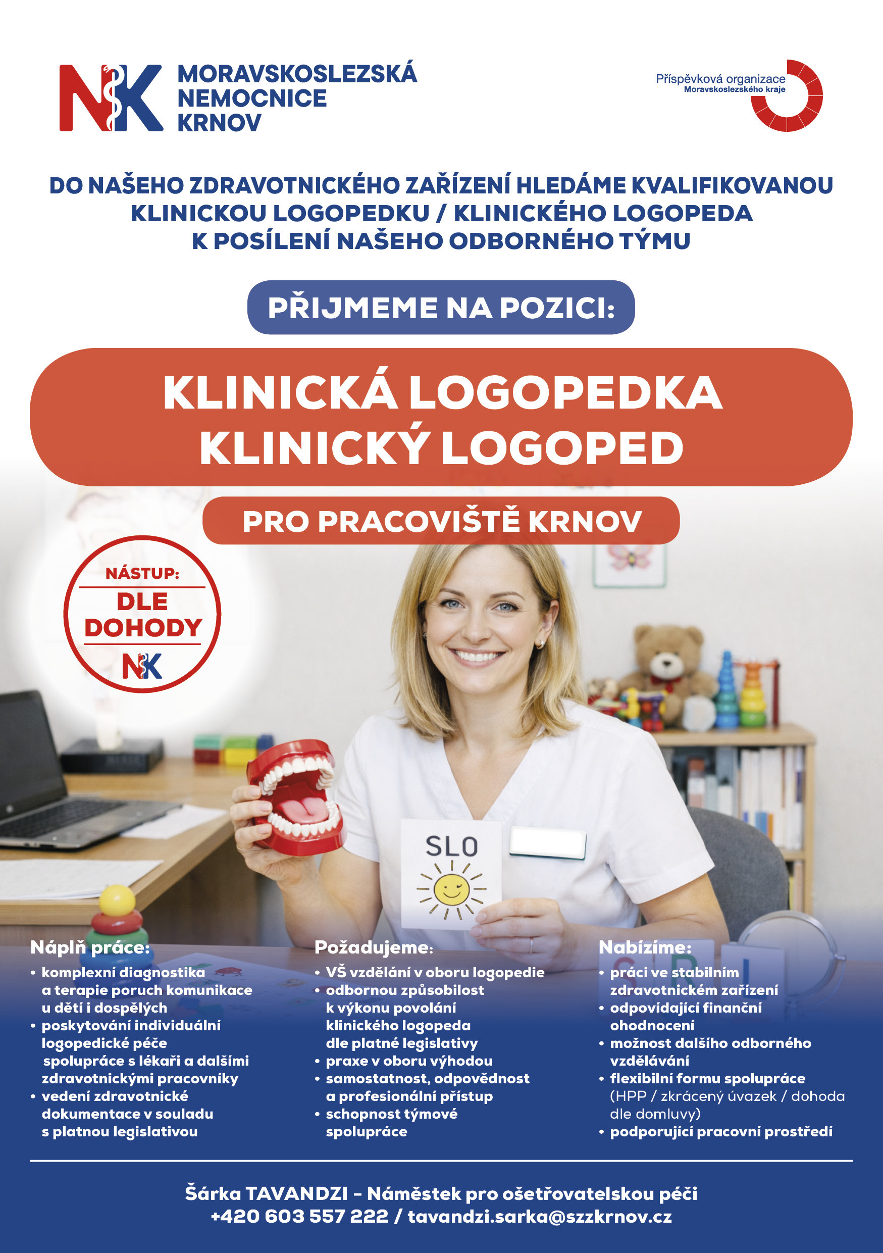 Klinický logoped se věnuje dětem i dospělým s narušenou komunikační schopností. Odborný tým Moravskoslezské nemocnice Krnov uvítá ve svých řadách logopeda či logopedku. Máte vysokoškolské vzdělání v oboru logopedie? Můžeme se flexibilně dohodnout i na zkrácený úvazek.