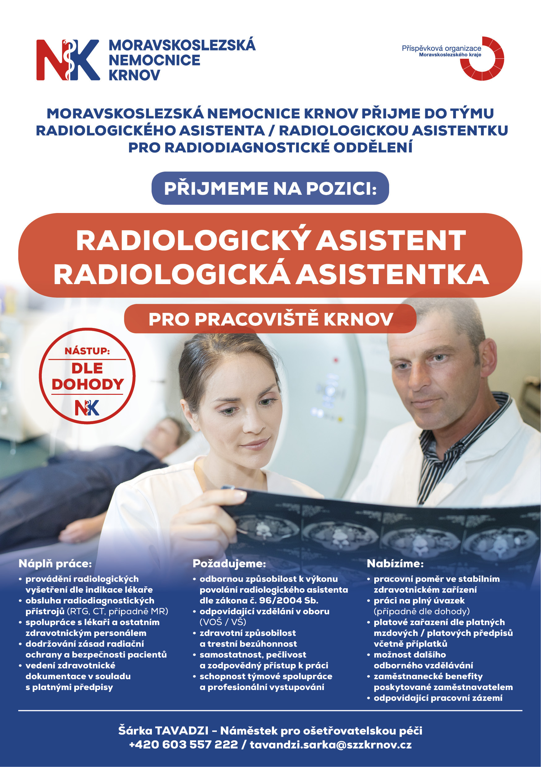 Krnovská nemocnice příjme radiologického asistenta. Do náplně práce patří obsluha radiodiagnostických přístrojů (RTG, CT, případně MR) ve spolupráci s lékaři a vedení zdravotnické dokumentace. Nabízíme odpovídající pracovní zázemí, možnost dalšího odborného vzdělávání a zaměstnanecké benefity.
