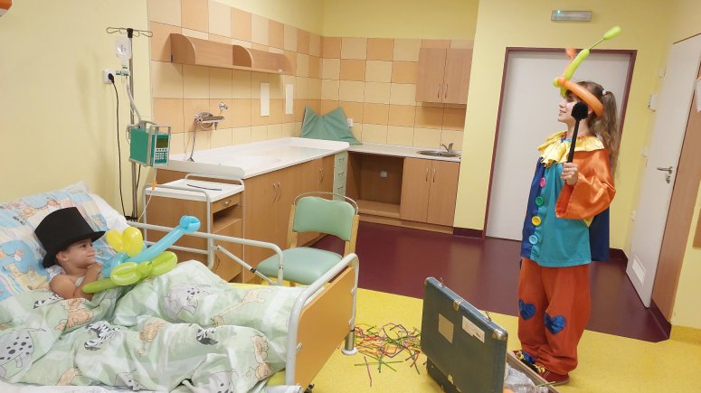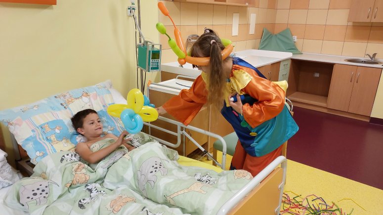 Úterý dopoledne své umění předvedla Adéla Valůšková, která si říká Klaunice Botička. „Představení jsou pokaždé jiná, menší děti potěší třeba zvířátko z balónku. Vyrábím pejsky, kočičky, teď v létě také včelky, palmy nebo i chobotnice. Starší děti se zabaví u hádanek nebo kouzelnických triků, proto mám s sebou kouzelný kufr. Cestujeme za dětmi tam, kde je nás potřeba. Největší odměnou je, když z nemocničního pokoje odcházím a vyprovází mě úsměv na tváři malých pacientů“ uzavřela Klaunice Botička.