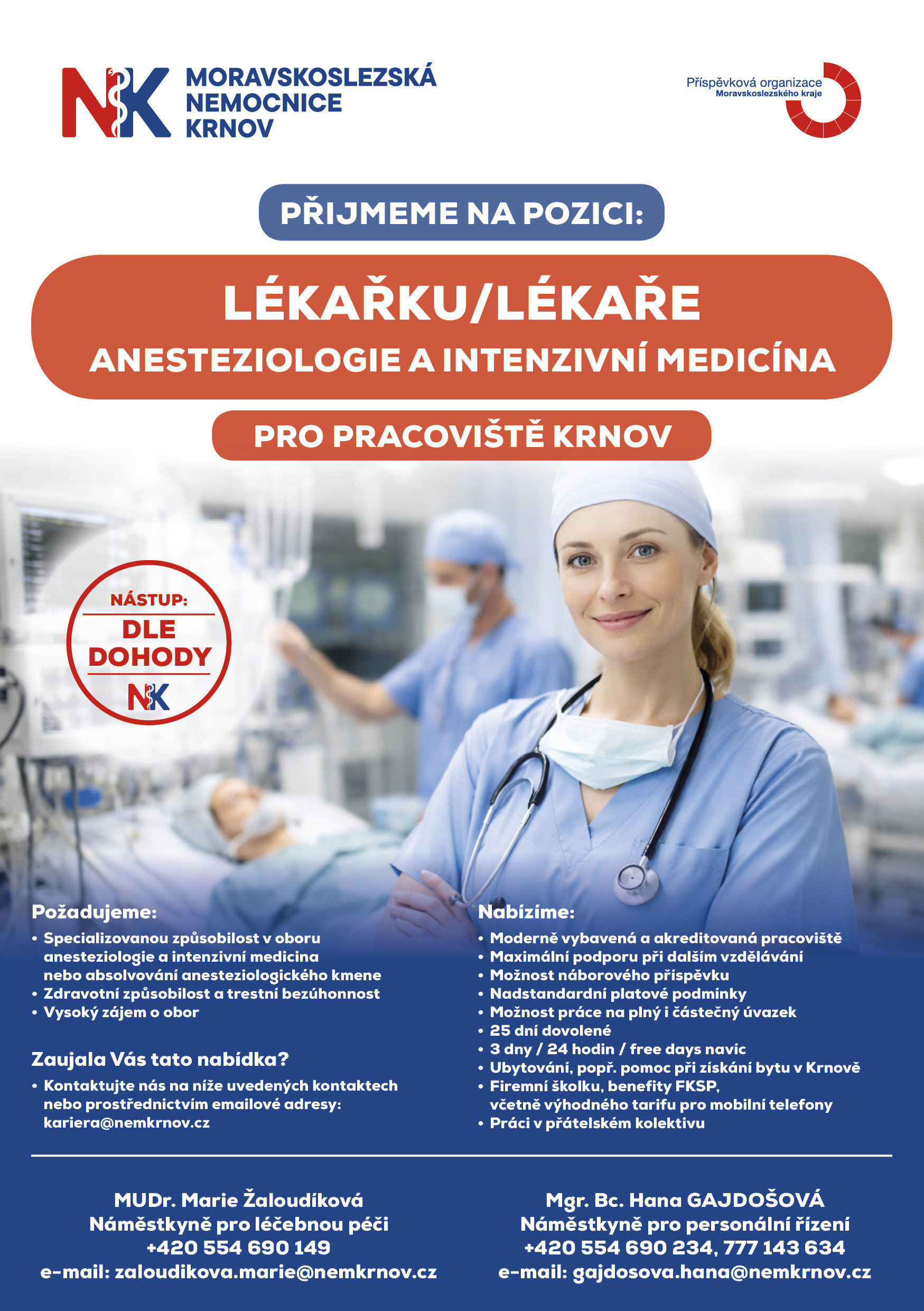 Morasvskoslezská nemocnice Krnov přijme lékaře nebo lékařku z oboru anesteziologie a intenzivní medicína. Jedná se o pracovní pozici na plný nebo částečný úvazek. Nabízíme nadstandardní platové podmínky a mimokrnovským zájemcům také pomoc s ubytováním.