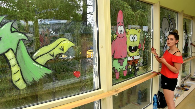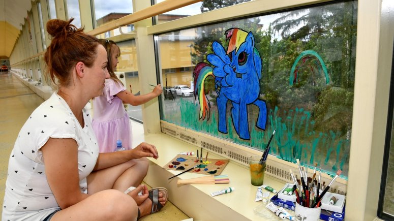 Malí pacienti dětského oddělení krnovské nemocnice mají za sebou netradiční zážitek. Ve středu 12. července pod dohledem zdravotníků a ve spolupráci s dobrovolníky Slezské Diakonie Krnov kreslili na skla nemocničního koridoru obrázky. Nemocniční koridor u dětského pavilonu je tak zase o něco veselejší.