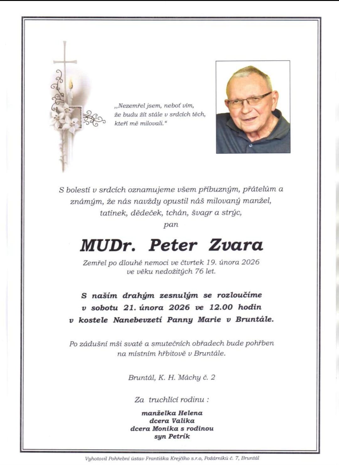S lítostí oznamujeme úmrtí MUDr. Petera Zvary