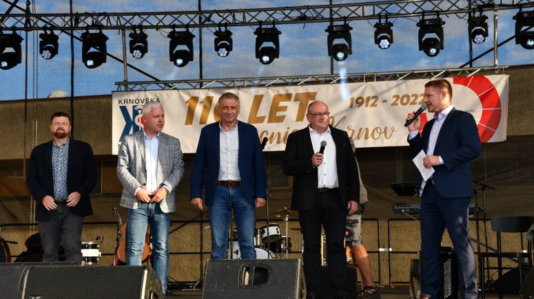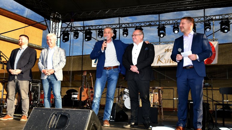 FOTO 110 let nemocnice Krnov 4, 5: Moderátor Roman Pastorek (vpravo) na pódium pozval zleva: starostu Krnova Ing. Tomáše Hradila, náměstka hejtmana MSK pro regionální rozvoj Jana Krkošku, hejtmana Moravskoslezského kraje prof. Ing. Ivo Vondráka, CSc., ředitele nemocnice MUDr. Ladislava Václavce, MBA.