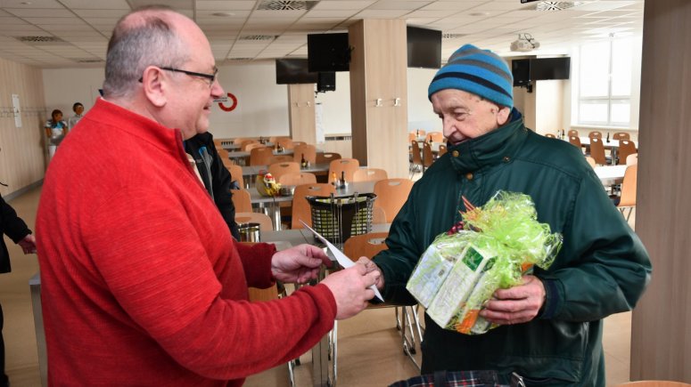 FOTO 1, 2, 3 – Rovných sto let oslavil pan Šustek, který si pravidelně vyzvedává obědy v jídelně krnovské nemocnice. K významnému jubileu a mnoho zdaru do dalších let mu popřál ředitel krnovské nemocnice a senátor MUDr. Ladislav Václavec, MBA. Foto: SZZ Krnov