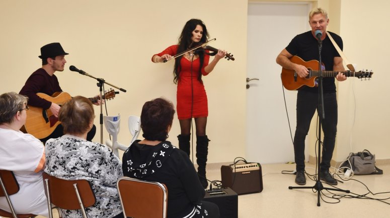 FOTO – Populární zpěvák Martin Maxa v doprovodu kytaristy Tomáše a houslistky Jolany zpříjemnil pacientům v nemocnici ve Městě Albrechticích ve čtvrtek 7. prosince adventní čas. Foto: Jiří Krušina