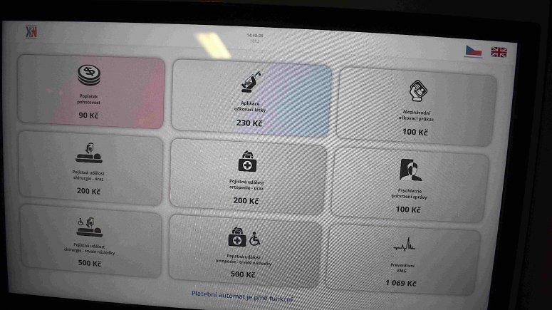 Pomocí platbomatu lze samozřejmě hradit také další správní poplatky, jako vyřízení Mezinárodního očkovacího průkazu, aplikaci očkovací látky, preventivní EMG vyšetření, nebo další zpoplatněné výkony. Díky platbomatu vyřídí pacient všechno sám i mimo úřední hodiny nemocniční pokladny.